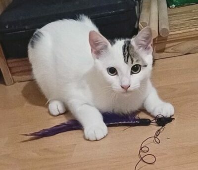 Avalon est un chaton blanc et tigré, âgé de 5 mois né dans une zone industrielle à Bègles d’une chatte sauvage maintenant stérilisée.