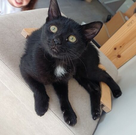 Amidala est une chatonne de couleur noire avec une tâche blanche dans le cou et sur le ventre, âgée d’environ 3 mois 1/2. Née sur une entreprise à Eysines, d’une chatte errante maintenant stérilisée (capture d’environ 30 chats, tous stérilisés et 6 chatons pris en accueil). En accueil avec sa soeur Araignée.