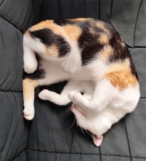 Pendant ses moments calmes, elle aime venir dormir sur le canapé, réclamer des câlins et faire plein de ronrons. Et manger est sa grande passion !