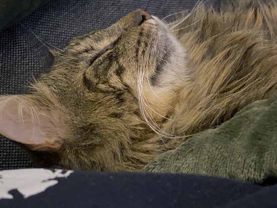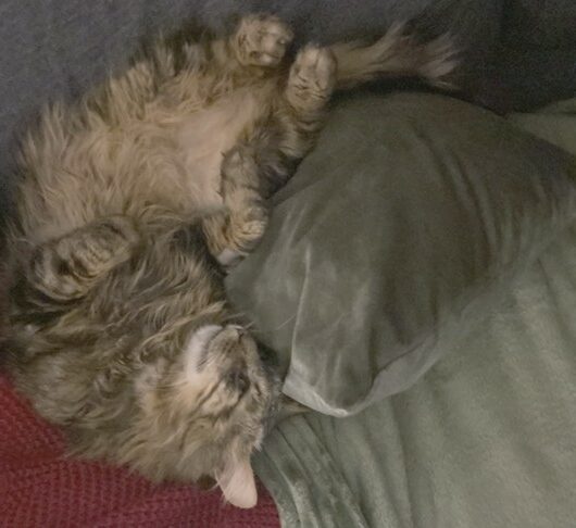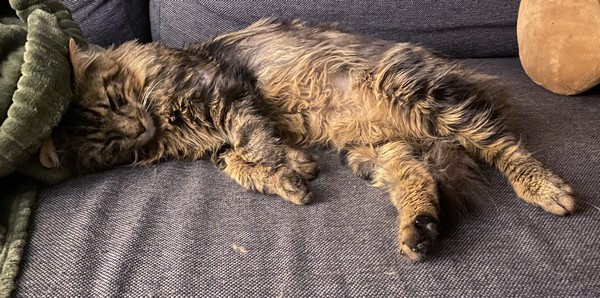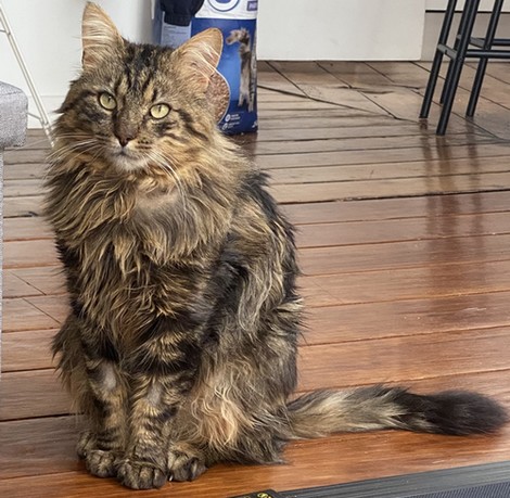 Un peu gourmand sur les bords, il faudra surveiller son alimentation… et surtout ne jamais laisser une tranche de jambon ou de surimi traîner sur la table, sous peine de ne plus jamais la revoir ! C’est un grand chat d’environ 6kgs.
