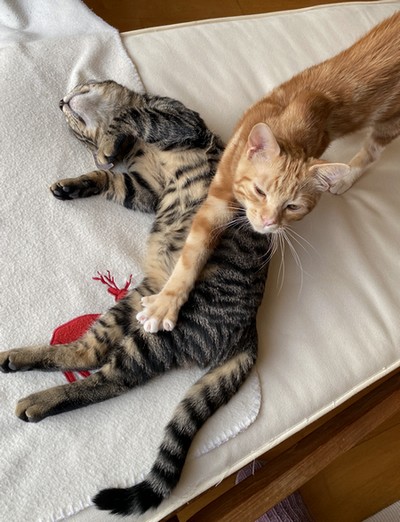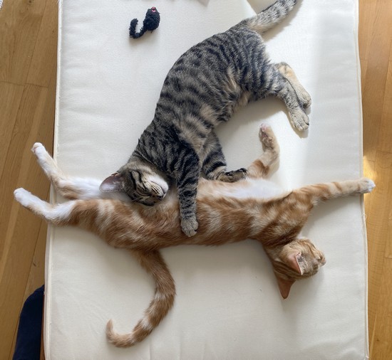 Ils apprécient les longues siestes. Mais le matin et le soir, ils se révèlent très actifs ! ARTY aime particulièrement courir après les balles rebondissantes ou de ping-pong. ARCHIBALD adore les souris et sa grosse balle en aluminium. Mais ce qu’ils préfèrent par-dessus tout, c’est se courir après et chahuter ensemble, parfois même un peu trop fort !