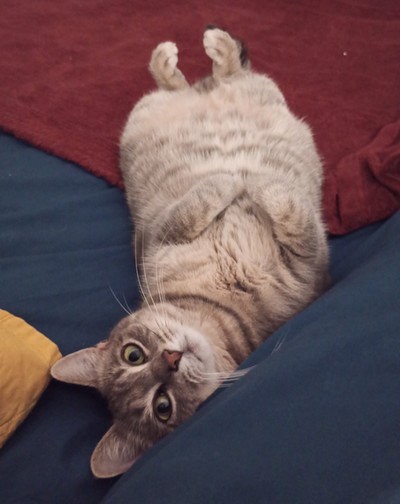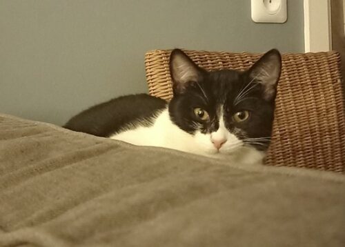 C’est une minette très attachante, mais qui a besoin qu’on soit patient avec elle et qu’on respecte ses limites (ne pas s’approcher trop vite, savoir quand la laisser tranquille…) pour continuer à évoluer.