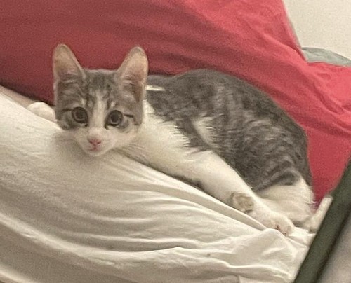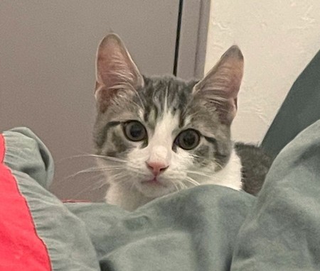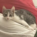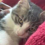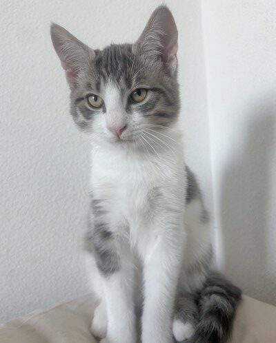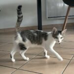 Asticot est un adorable chaton de 3 mois 1/2, au pelage blanc et tigré très doux. Né dehors d’une chatte errante (maintenant stérilisée). Fratrie: Aimé et Arrow.