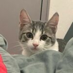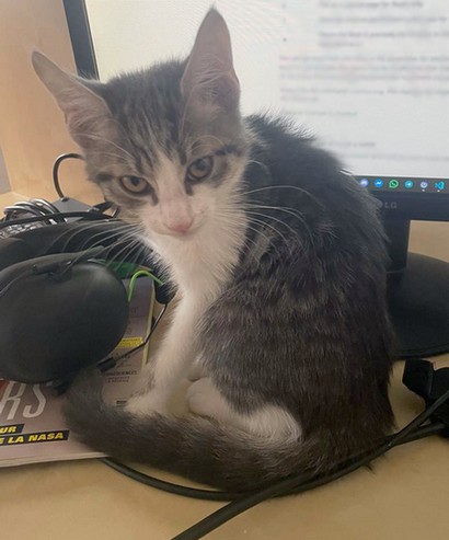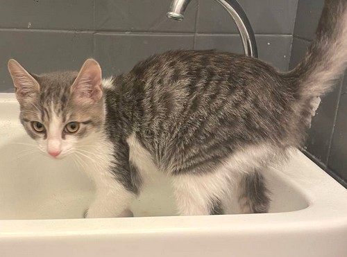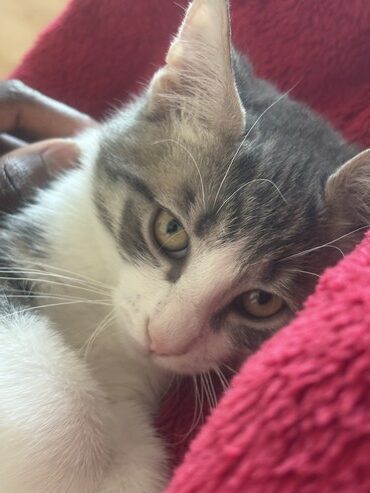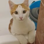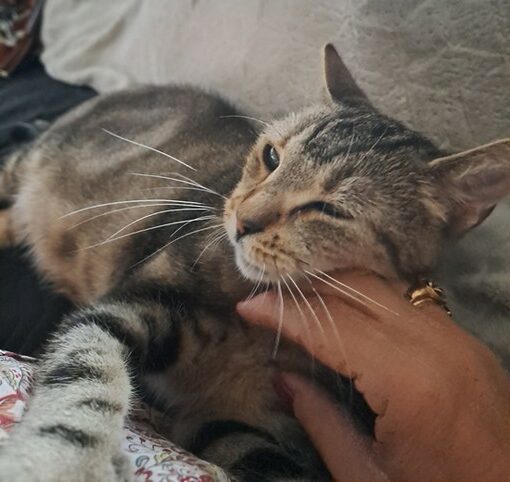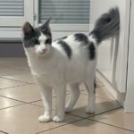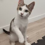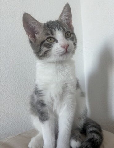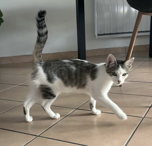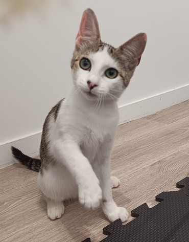 C’est un petit chat qui a toujours vécu avec d’autres chats. Il a un référent à la maison qu’il suit partout et qui lui apprend à devenir sociable.