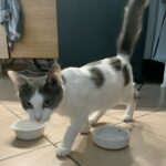 L’heure de la pâtée du soir est aussi primordiale. Comme il est très gourmand il « fait la vaisselle », c’est-à-dire qu’il finit toujours les gamelles des autres chats.