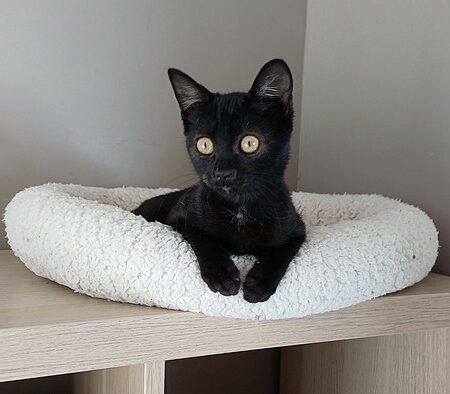 Araignée est une chatonne de couleur noire, âgée d’environ 3 mois 1/2. Née sur une entreprise à Eysines, d’une chatte errante maintenant stérilisée (capture d’environ 30 chats, tous stérilisés et 6 chatons pris en accueil). En accueil avec sa soeur Amidala.