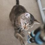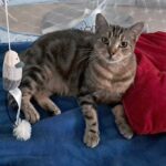 C’est un petit chat très dynamique, surtout le matin et le soir. Les séances de jeu et de galopades sont endiablées avec les chats de la maison, avec lesquels il s’entend très bien.