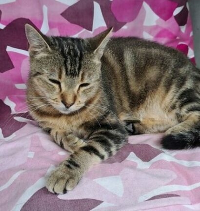 Rebelle est une minette tigrée aux jolis yeux verts, âgée de 1 an. Elle errait sur une entreprise à Pessac avec ses 4 chatons de 3 semaines. Le site étant dangereux pour de si petits chatons, nous avons accueilli toute la petite famille afin de les mettre en sécurité le temps que les chatons soient en âge d’être adopté. Ils ont depuis été adopté.